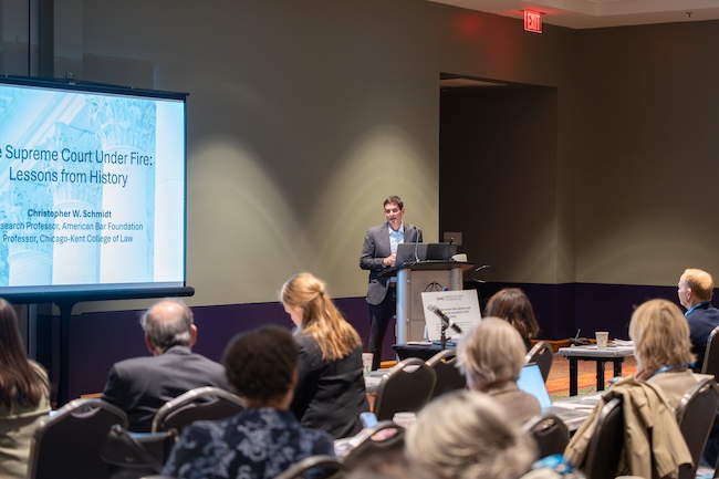 A recent ABF Fellows CLE program sought to explore the Court’s complicated position as both a provoker of controversy and a protector of democracy, and to consider where this moment fits into the Court’s history. The program, titled “The Supreme Court and the Second Trump Administration,” was held at the 2026 ABA Midyear Meeting in San Antonio. The program featured a panel discussion between Christopher W. Schmidt and Paul M. Smith.